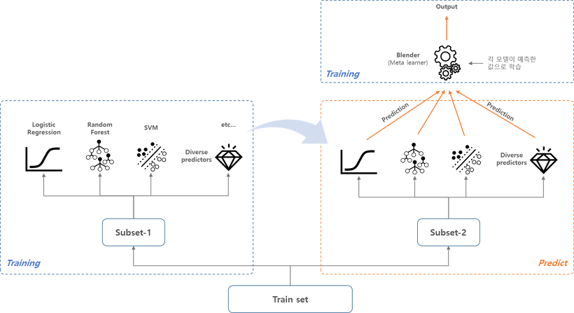 - 서로 다른 모델들을 합쳐서 새로운 모델을 만드는 것.(Bagging / Boosting은 동일 한 모델을 subsampling 을 통한 방법으로 합쳤었다.)